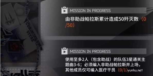 任务2:使用至多2人(包含助战)的队伍3星通关主题曲3-6;必须编入非助战帕拉斯并上场,其他成员仅可编入医疗干员。