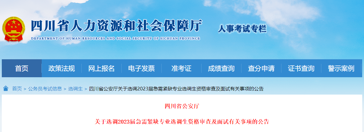 原文标题:四川省公安厅关于选调2023届急需紧缺专业选调生资格审查及面试有关事项的公告