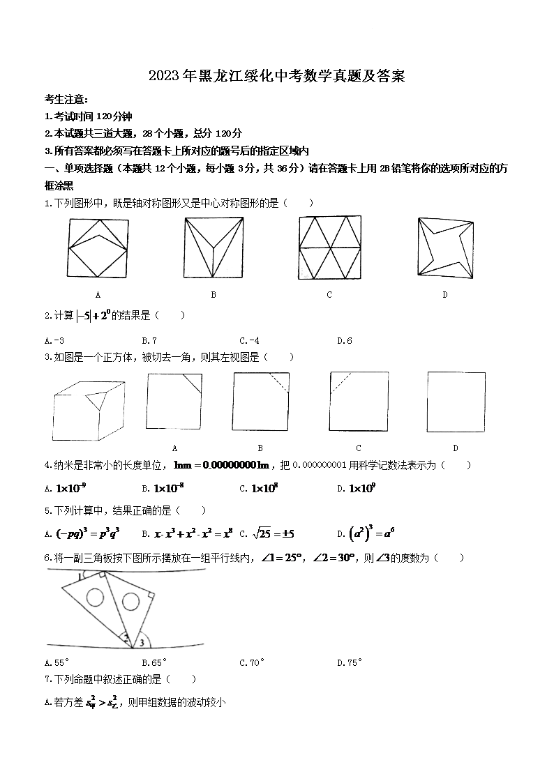 2023年黑龙江绥化中考数学真题及答案(Word版)06-29