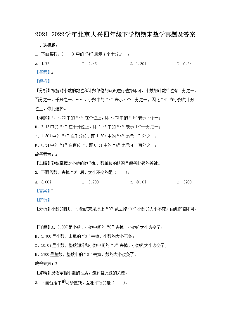 【文档预览】 文档大全网整理发布2021-2022学年北京大兴四年级下学期期末数学真题及答案(Word版),前五页预览如下: