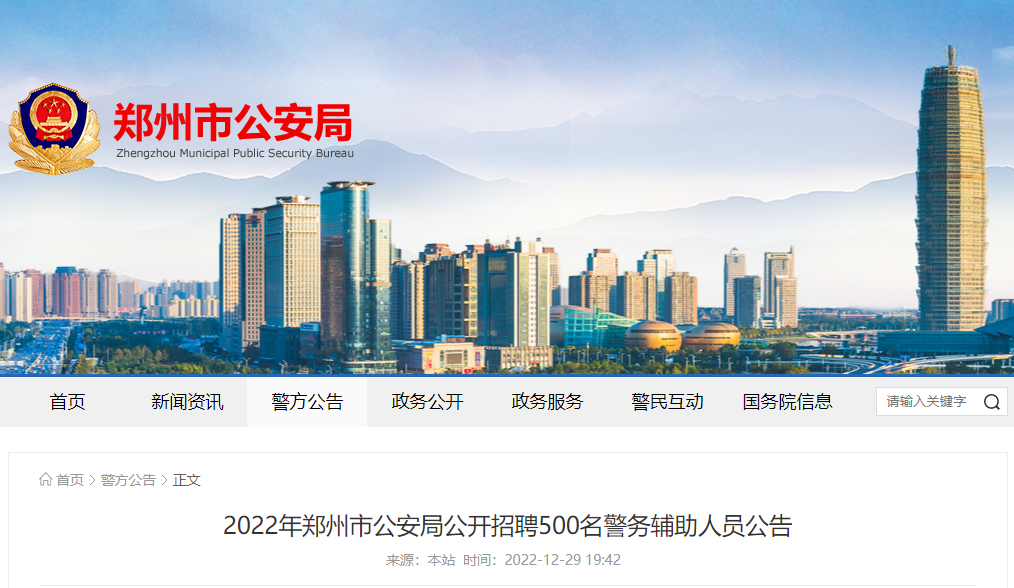 原文标题:2022年郑州市公安局公开招聘500名警务辅助人员公告