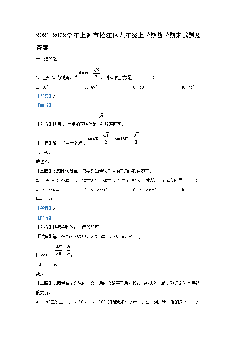 【文档预览】 文档大全网整理发布2021-2022学年上海市松江区九年级上学期数学期末试题及答案(Word版),前五页预览如下: