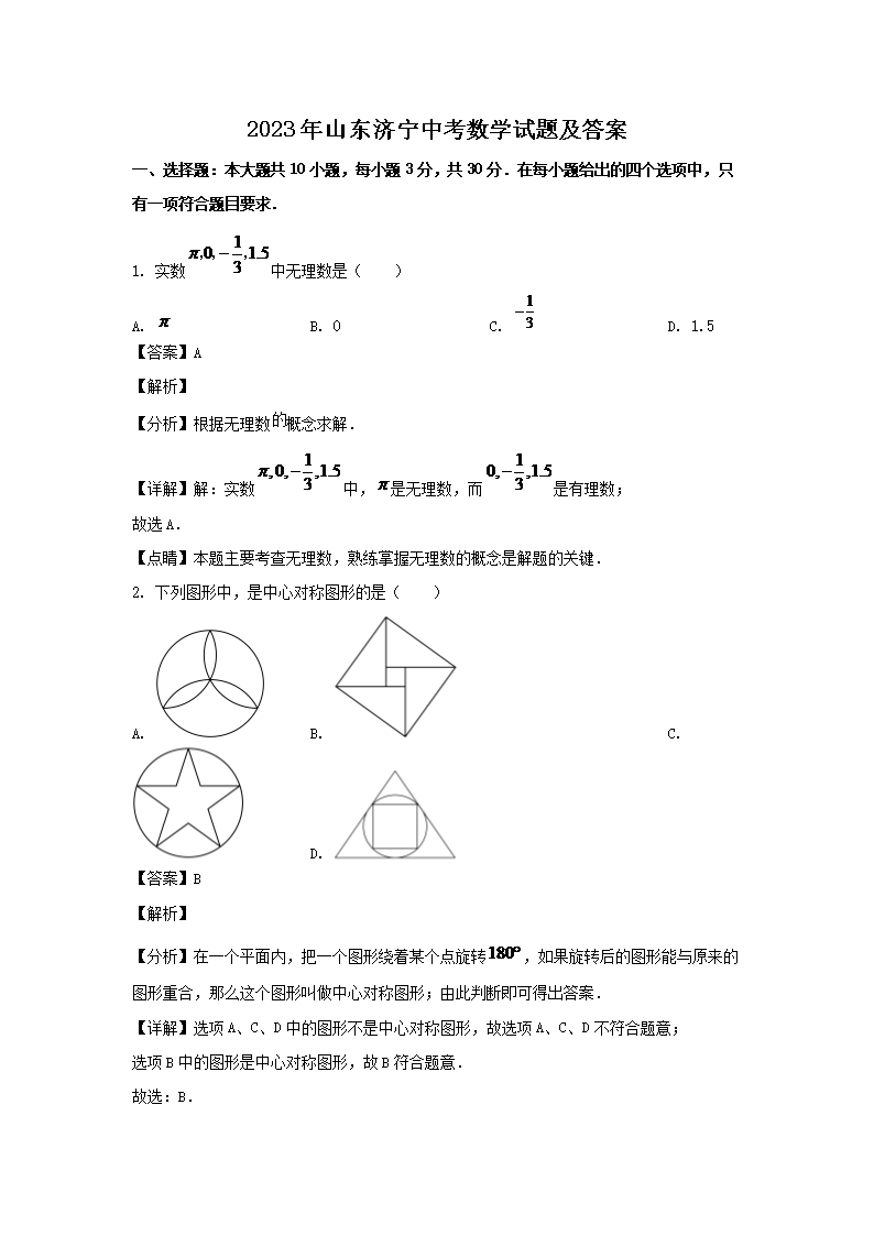 2023年山东济宁中考数学试题及答案(Word版)07-01