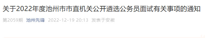 【#遴选# 导语】©文档大全网从池州先锋公众号了解到,2022年安徽池州市直机关公开遴选公务员面试时间:12月24日,相关事宜如下: