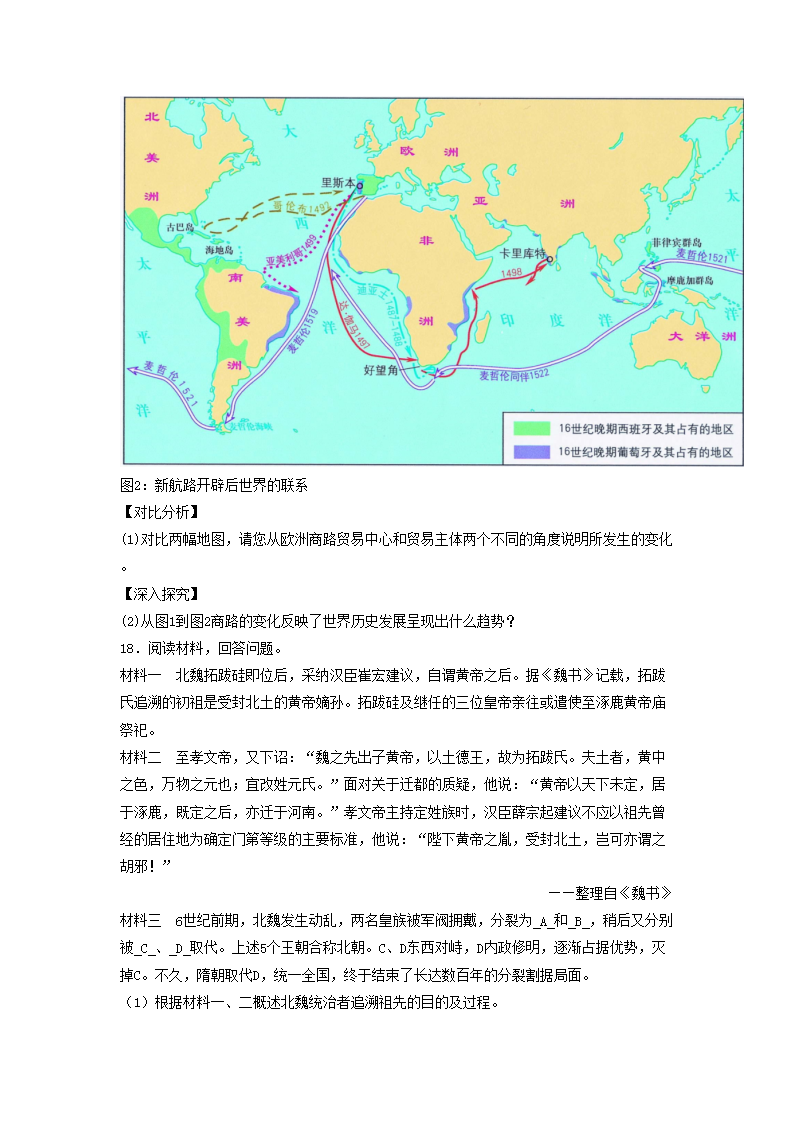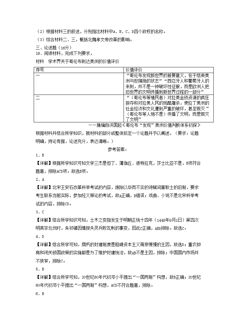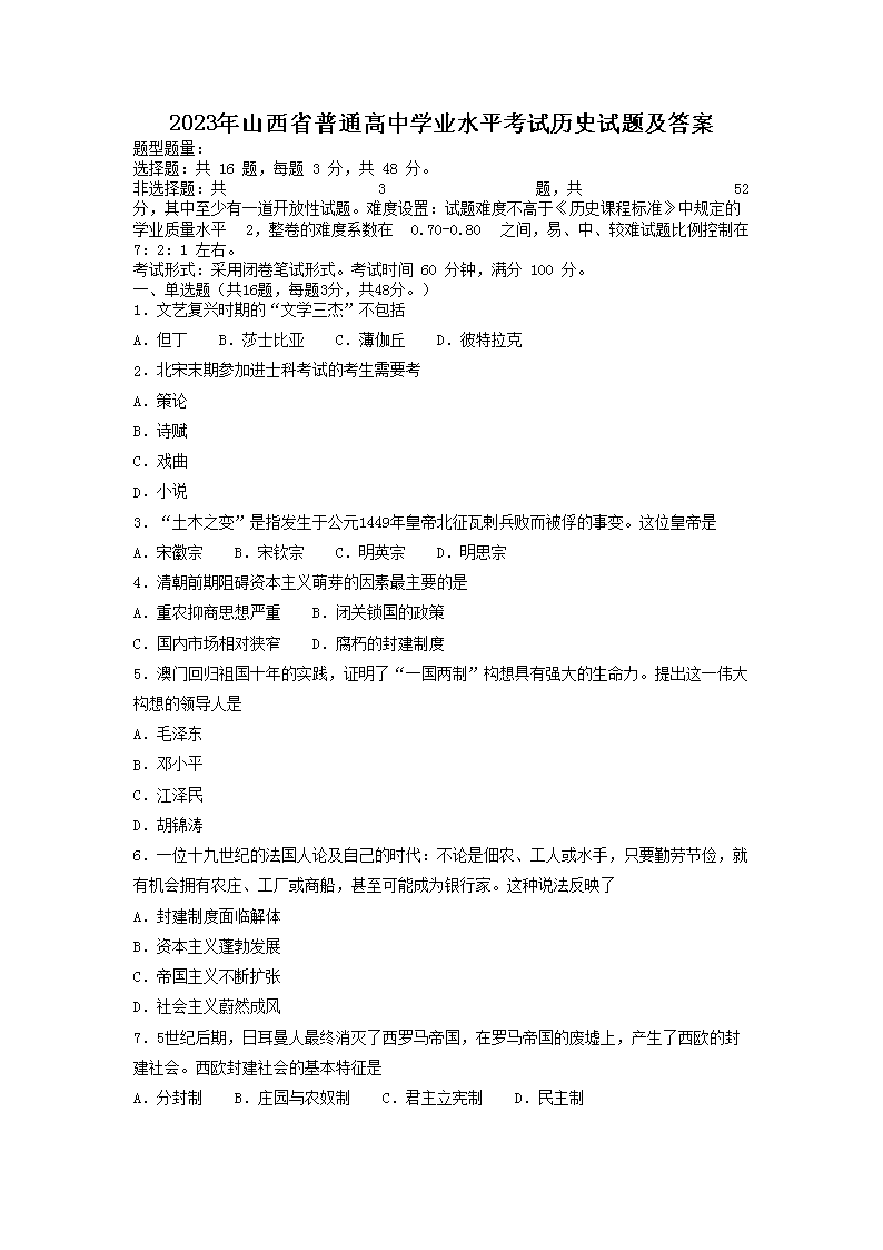 2023年山西省普通高中学业水平考试历史试题及答案(Word版)07-28