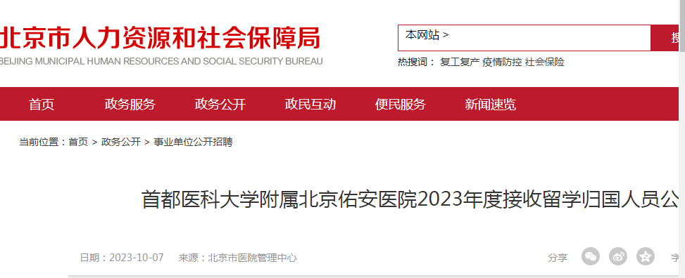 【#留学生招聘# #2023年首都医科大学附属北京佑安医院接收留学归国人员公告(报名截止10月20日)#】©文档大全网从“北京市人力资源和社会保障局”了解到,2023年首都医科大学附属北京佑安医院接收留学归国人员,请于2023年10月20日17:00前登录北京佑安医院官方网站(大众版)——首页“医政信息”板块——“招聘系统”申请岗位。招聘详情如下: