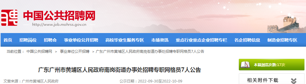 2022年广东省广州市黄埔区人民政府南岗街道办事处专职网格员招聘公告【7人】10-01