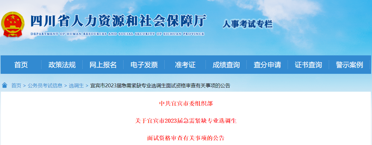 原文标题:宜宾市2023届急需紧缺专业选调生面试资格审查有关事项的公告
