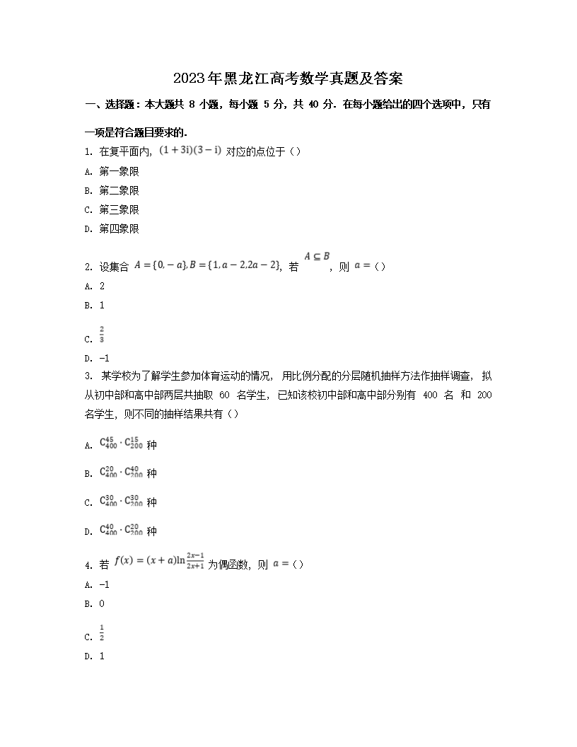 2023年黑龙江高考数学真题及答案(Word版)06-09