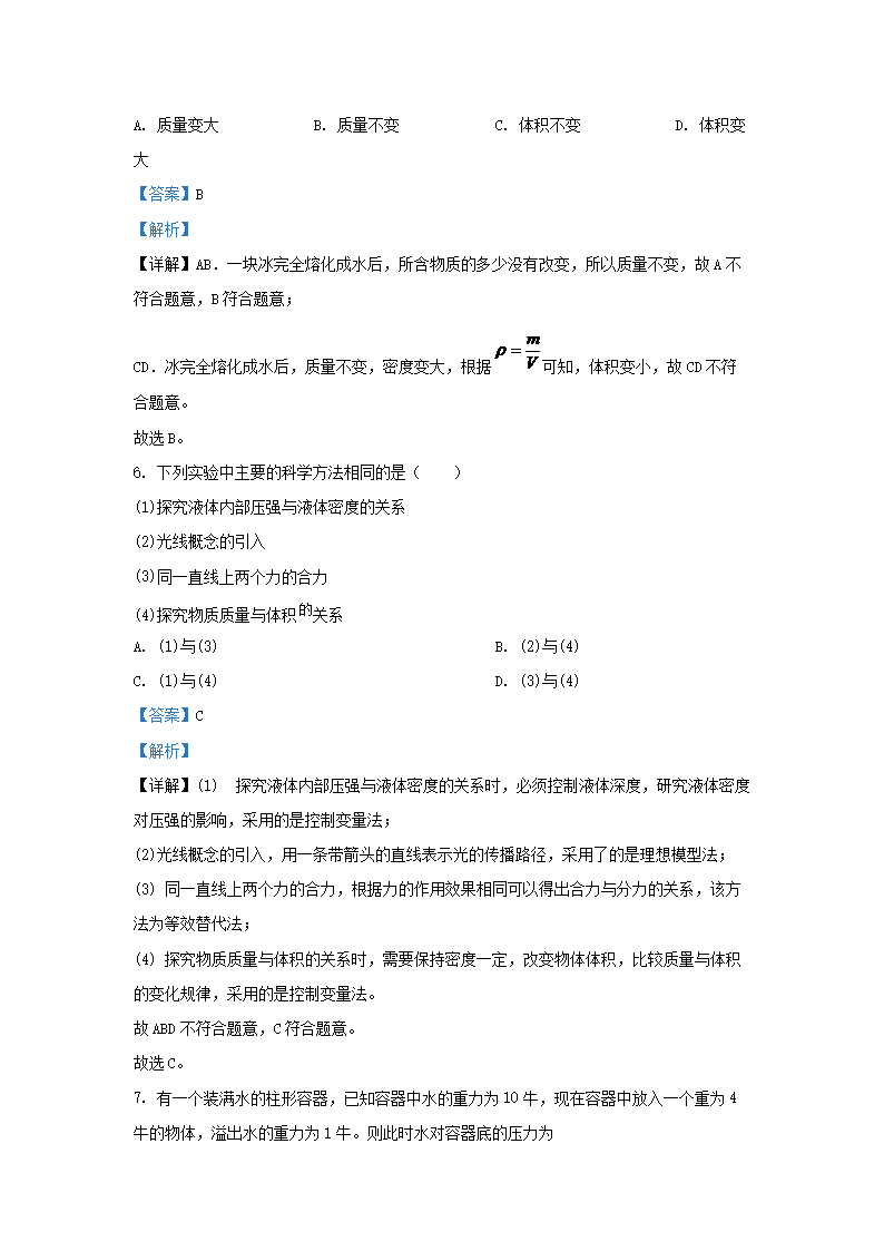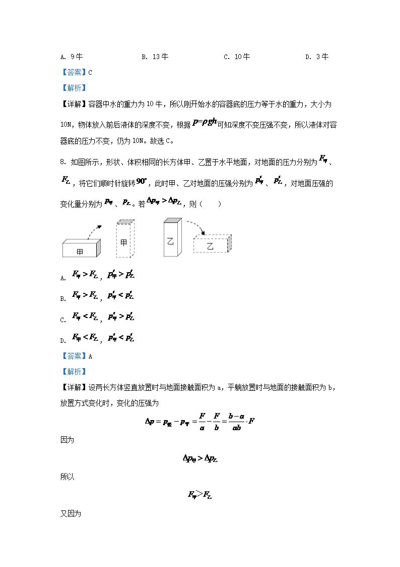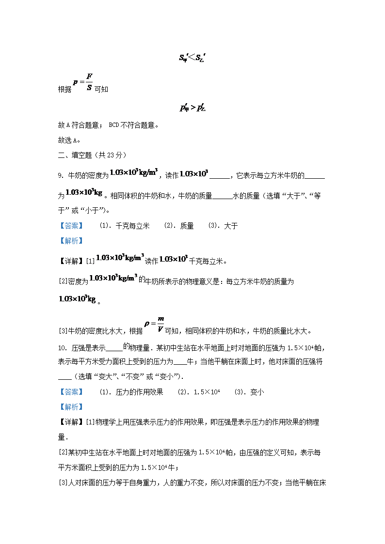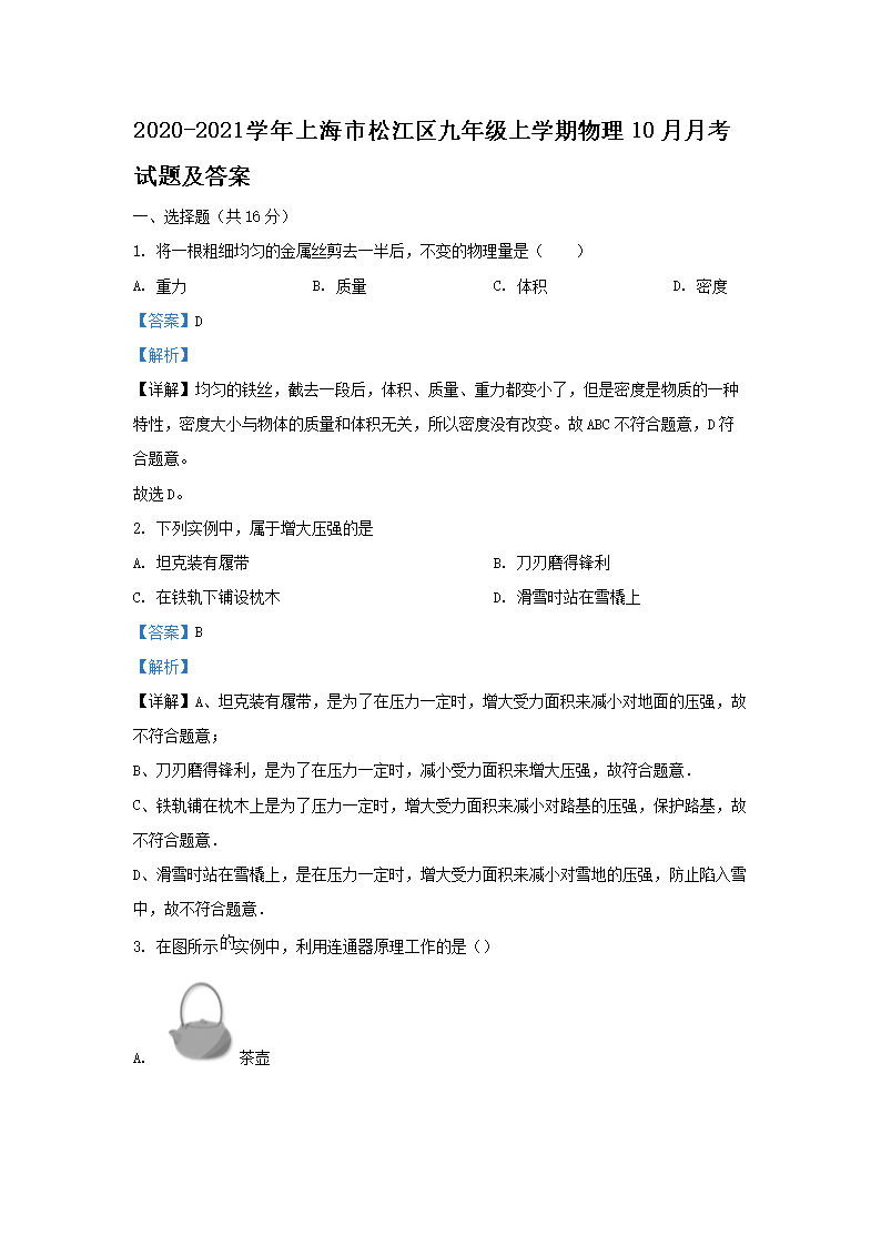 2020-2021学年上海市松江区九年级上学期物理10月月考试题及答案(Word版)10-21