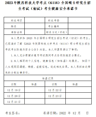 3.下载《2023年陕西科技大学考点(6114)全国硕士研究生招生考试(初试)考生健康安全书》(见附件),于12月19日至23日每日进行体温测量、记录和健康状况监测,考前自行打印并签字确认。
