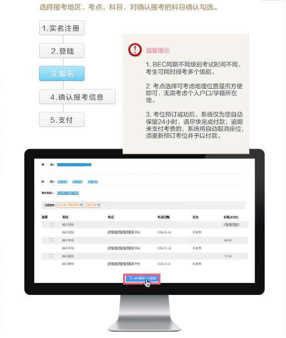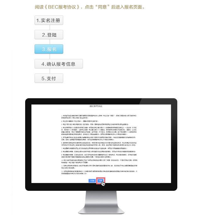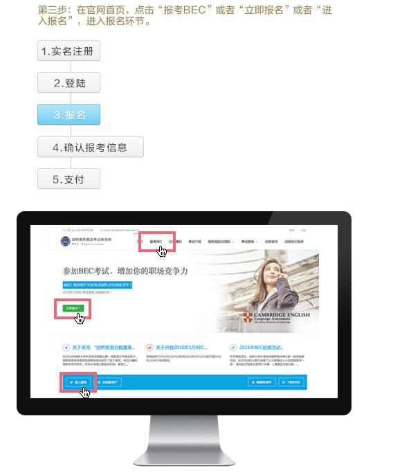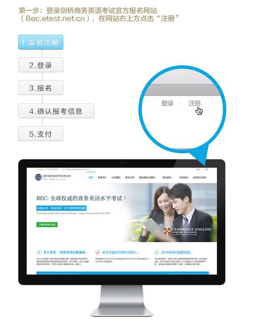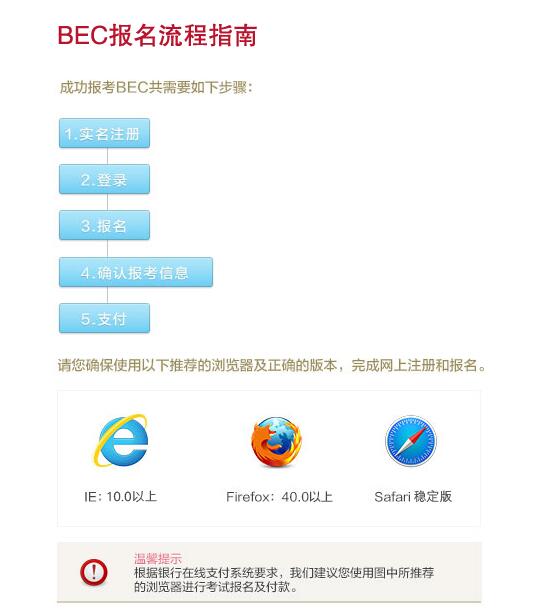 电脑系统:剑桥商务英语证书考试(BEC)网上报名要求考生使用联接互联网的电脑并装有浏览器(推荐使用MicrosoftIE9、10、11和火狐最新版本)。推荐显示分辨率设为1366*768。电脑须安装简体中文输入法以输入考生中文姓名和地址。在汉字输入状态下,须采取半角方式输入数字。