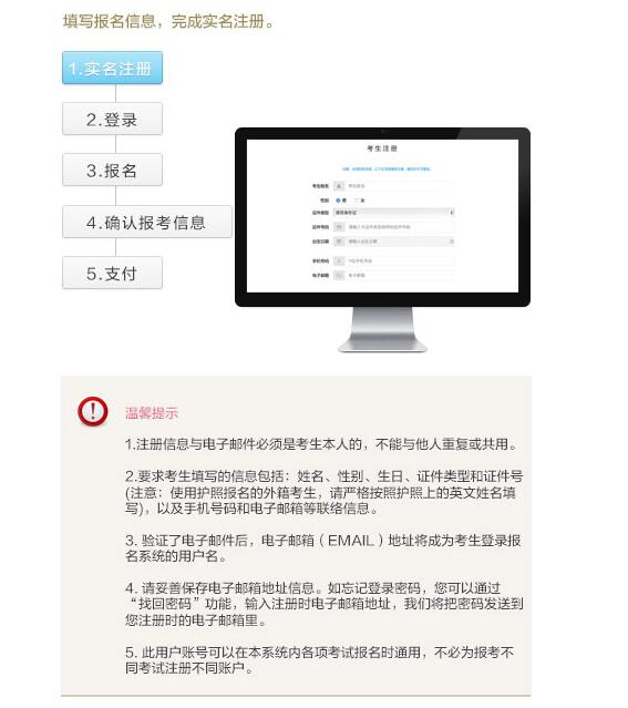考生报名时须如实、准确提交身份证信息,包括:证件类型、证件号码、中文姓名、拼音姓名、性别和出生日期,确认提交后,不得更改,并将打印在准考证上;考生在考试日须携带与准考证信息一致的有效身份证件原件。