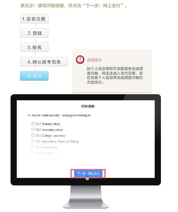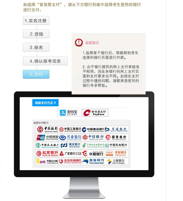 网上支付考费:剑桥商务英语证书考试费的支付方式仅限于网上支付。考生可任选报名网站所连接的网上银行支付系统交纳考费。