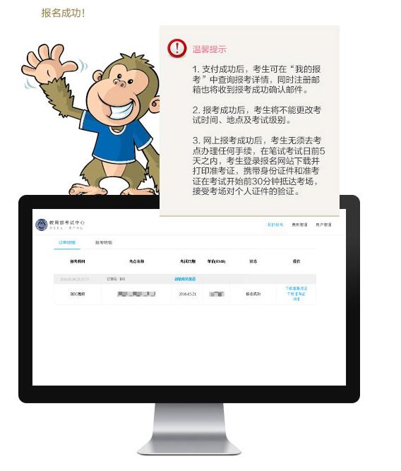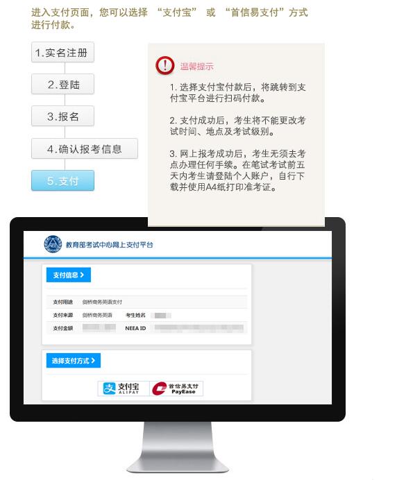 网上报名成功并完成在线缴费后,报名即刻生效。所有报考信息包括选择的考点、考试时间、考试科目等信息将都不允许更改,考试费不予退还。请考生在进行缴费前,慎重核对所有个人信息和报考科目信息,确认无误后,再进行网上支付。考生如不能按时参加考试,将视为缺考,考试费不予退还。