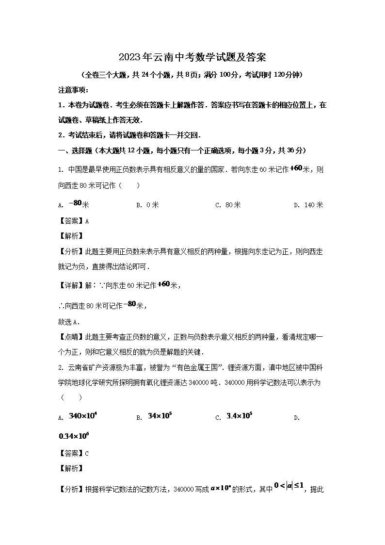 【文档预览】 文档大全网整理发布2023年云南中考数学试题及答案(Word版),前五页预览如下: