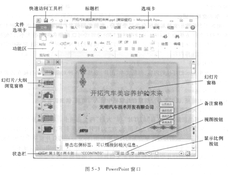正在编辑演示文稿的PowerPoint窗口如图5—3所示,可以看到,工作界面由快速访问工具栏、标题栏、选项卡、功能区、幻灯片/大纲浏览窗格、幻灯片窗格、备注窗格、状态栏、视图按钮、显示比例按钮等部分组成。