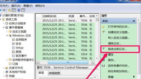 因为“Windows日志”记录很多的事件,如果查看所有日志,肯定太多了,必须先筛选一下,到“系统”这一项右边的窗口,选择“筛选当前日志...”。