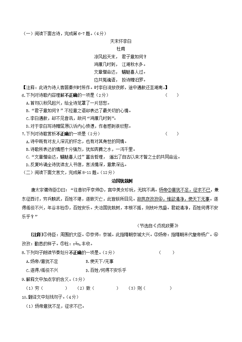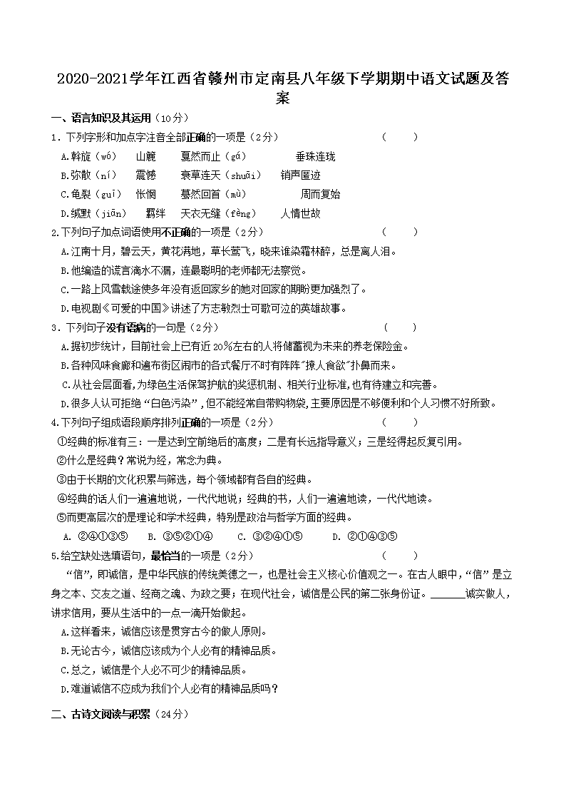 2020-2021学年江西省赣州市定南县八年级下学期期中语文试题及答案(Word版)10-19