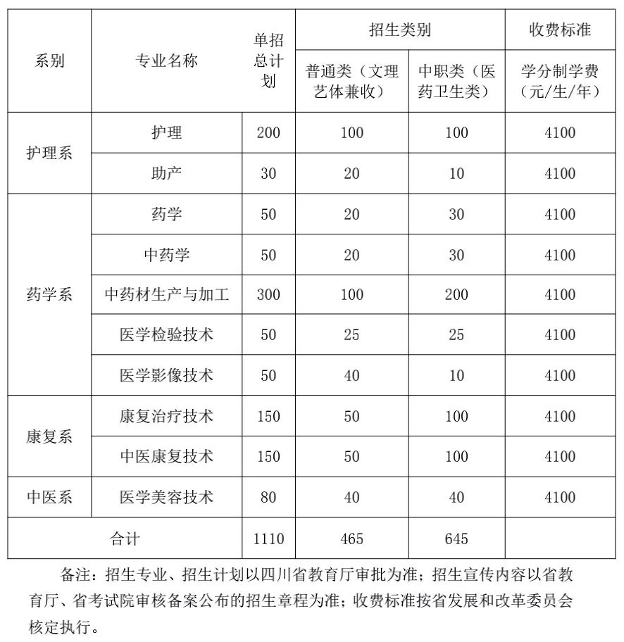 学院设有中医系、药学系、护理系、康复系和基础教育部,开设了护理、中药学、中医康复技术、中药材生产与加工、康复治疗技术、医学检验技术、医学影像技术、药学、助产、中医学、针灸推拿、医学美容技术等12个专业。
