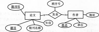 题目给出了两个实体论文和作者,并且指明了论文实体的属性包括题目、期刊名称、年份、期刊号,作者实体的属性包括姓名、单位、地址。实体问的关系包括:一篇论文可以有多个作者,且每一位作者写过多篇论文,在每一篇论文中有作者的顺序号,可以知道论文和作者是多对多的关系。同时可知论文题目和期刊号的联合是论文关系模式的主键,姓名是作者关系模式的主键,而需要作者姓名和论文题目才能确定发表的关系模式。