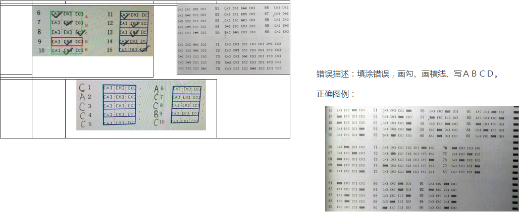 错误描述:填涂错误,画勾、画横线、写ABCD。