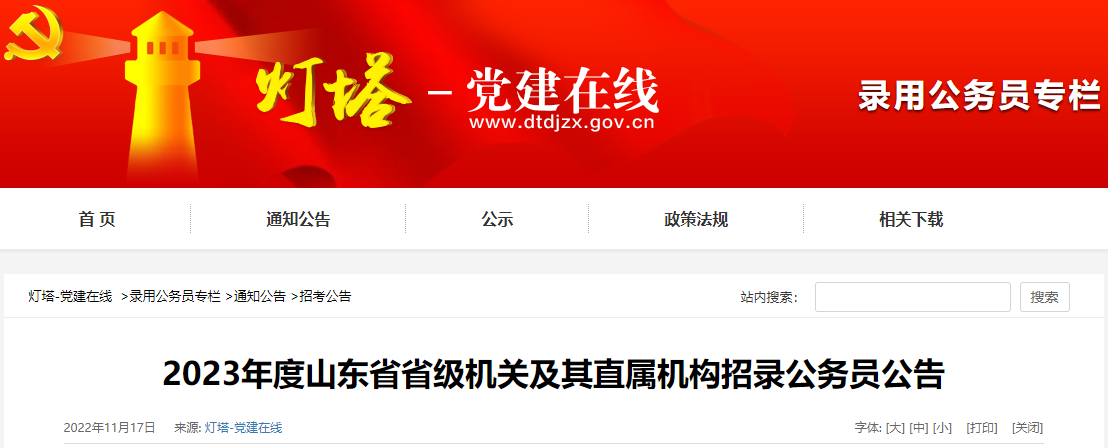 【#公务员考试# 导语】灯塔-党建在线发布了《2023年度山东省省级机关及其直属机构招录公务员公告》,©文档大全网从公告中获悉,2023年山东省考公务员报名时间:2022年11月19日-22日,考试时间:2022年12月17日,具体事宜详见《招考公告》,©文档大全网小编在此将相关信息摘录如下,预祝大家顺利成“公”!