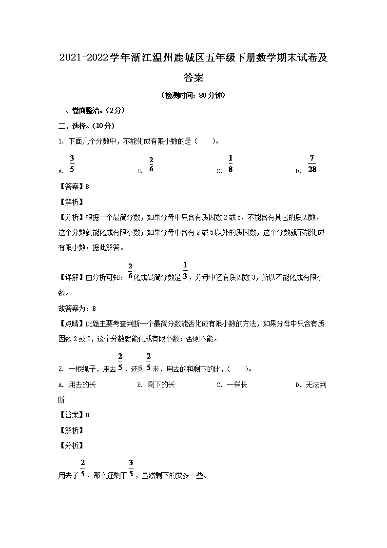 【文档预览】 文档大全网整理发布2021-2022学年浙江温州鹿城区五年级下册数学期末试卷及答案(Word版),前五页预览如下: