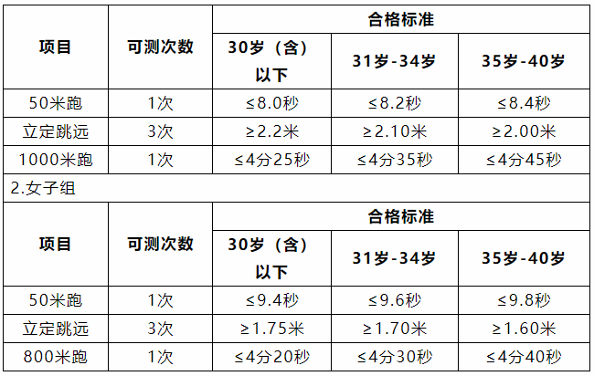 3.体能测试的项目和标准参照公安民警体能测试标准的有关规定执行,具体项目如下: