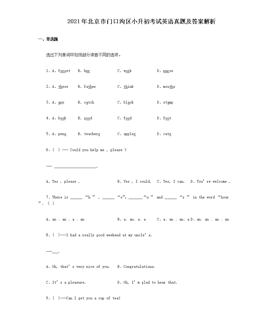 2021年北京市门口沟区小升初考试英语真题及答案解析(Word版)09-28