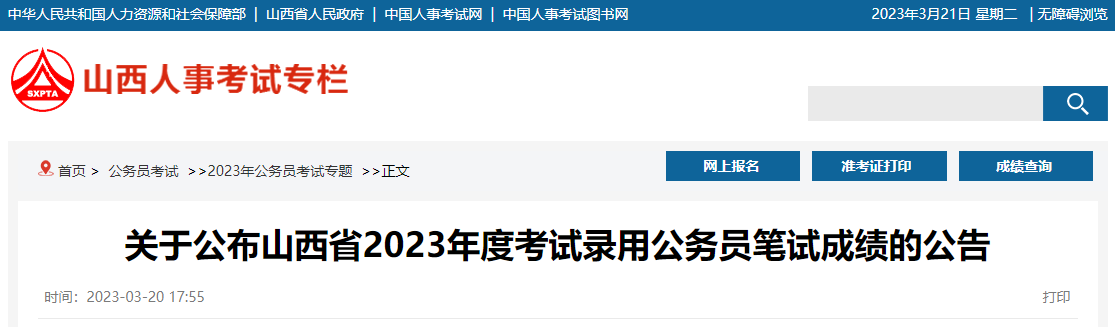 原文标题:关于公布山西省2023年度考试录用公务员笔试成绩的公告