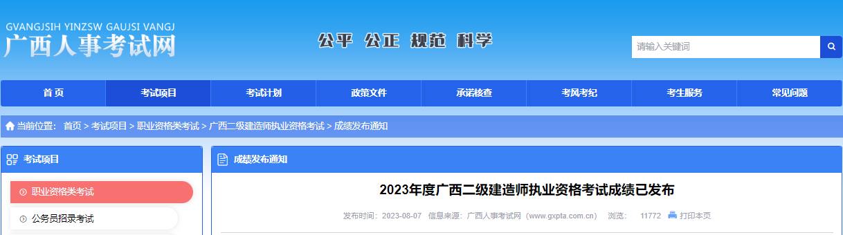 2023年广西二级建造师考试成绩查询时间:8月7日起,报考人员通过“广西人事考试网(www.gxpta.com.cn)”查询考试成绩!