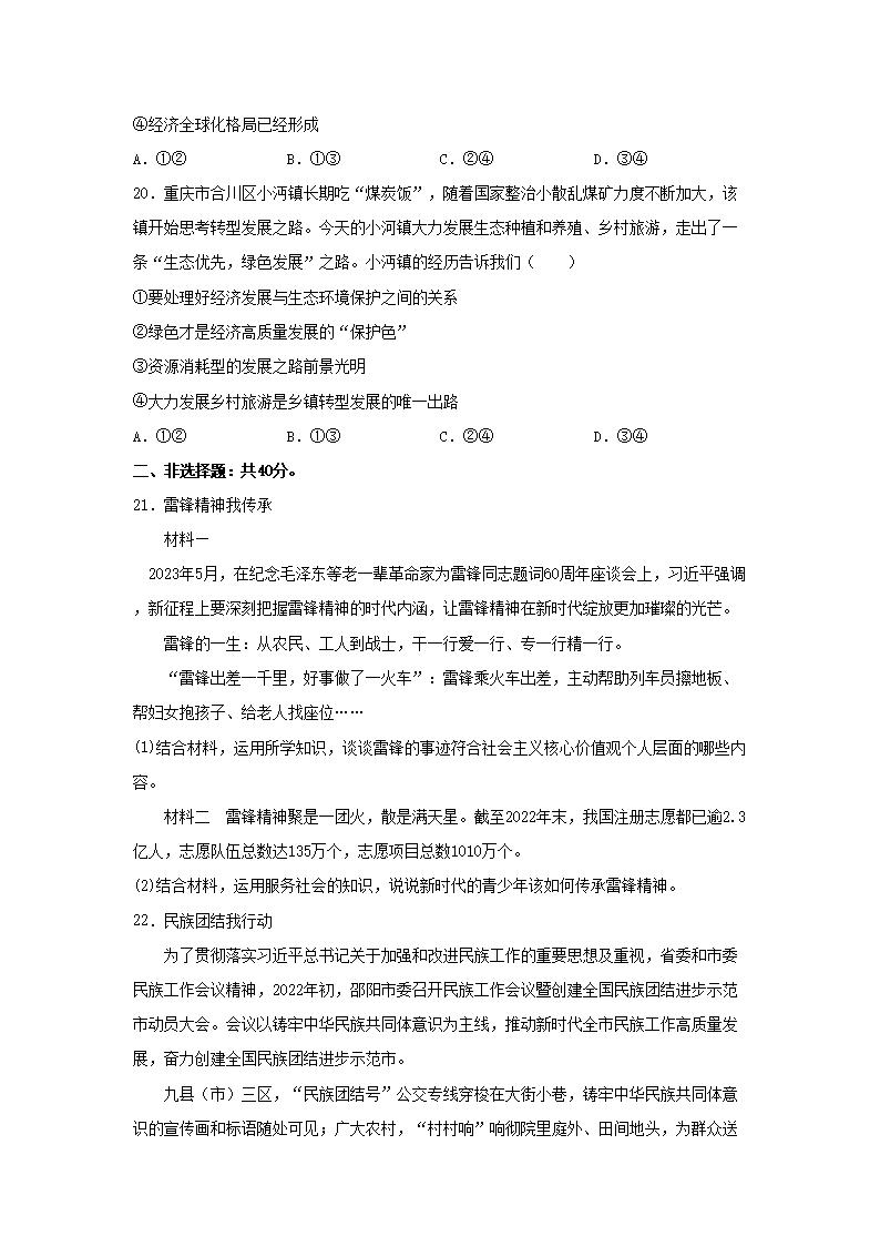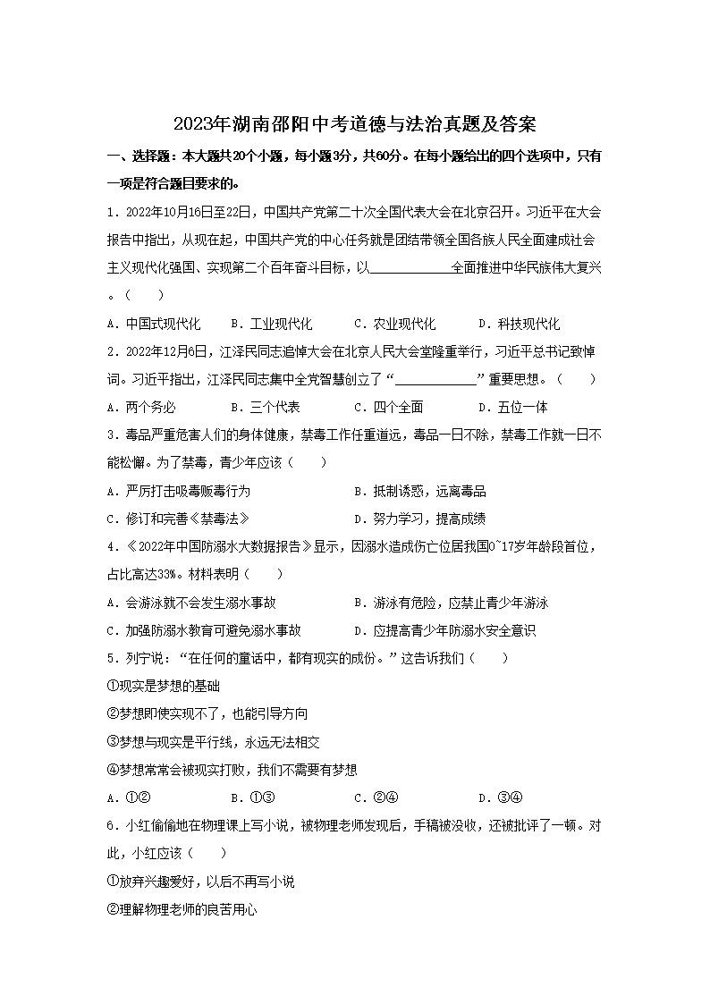 2023年湖南邵阳中考道德与法治真题及答案(Word版)07-25