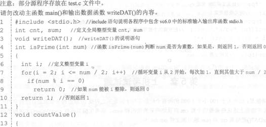 程序test.c的功能是:计算500~800区间内素数的个数cnt,并按所求素数的值从大到小的顺序,计算其间隔减、加之和,即第1个素数.第2个素数+第3个素数.第4个素数+第5个素数…的值sum。请编写函数count Value()实现程序的要求,最后main()函数调用函数writeOAT()把结果cnt和Sum,输出到文件out.dat中。