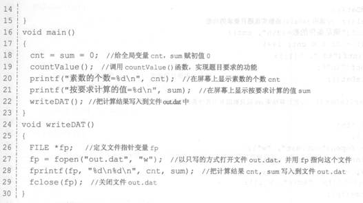 ③在每次执行for循环时,都调用素数判断函数isPrime()判断当前的i值是否为素数,如果是素数,则素数计数变量cnt值加1,正负号转换变量j的值乘以-1,实现正负数的交替转换,最后将每次循环得到的i*j的值累加到求和变量 sum中。