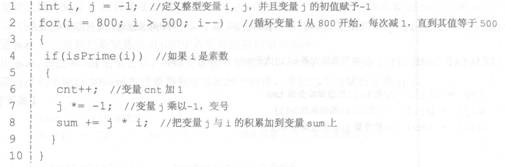 ②通过for循环对800到500的每个数字进行逐个的扫描,指定循环变量i的初值为800,当i值等于500停止循环,每执行一次循环,i的值便减1。(注意,本题for循环从大到小依次读取数据是根据题目要求设计的,这样得到的素数值其排序方式就是从大到小排序。)