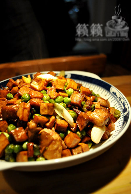 原料:香干;青豆;水煮五花肉;姜片;青蒜1根;盐;糖;生抽;老抽;