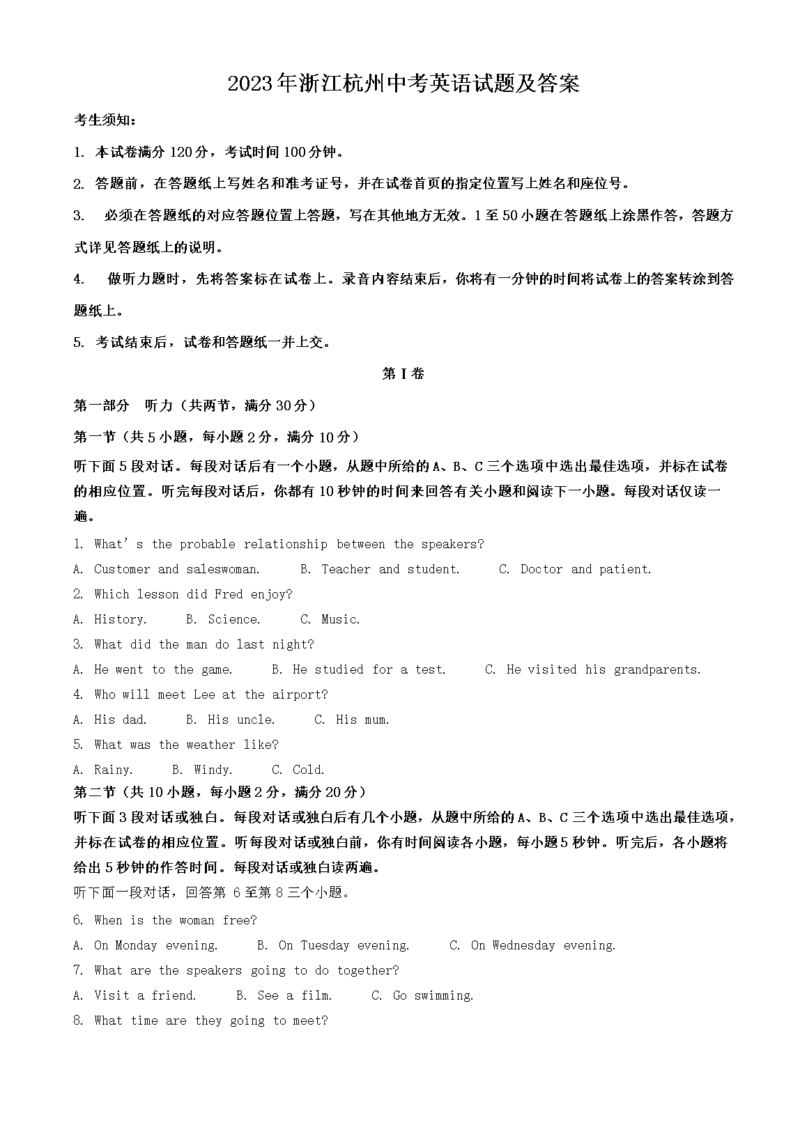 2023年浙江杭州中考英语试题及答案(Word版)07-18