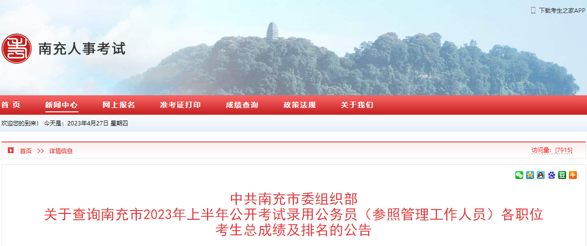 2023上半年四川南充市公务员各职位考生总成绩及排名查询公告04-28