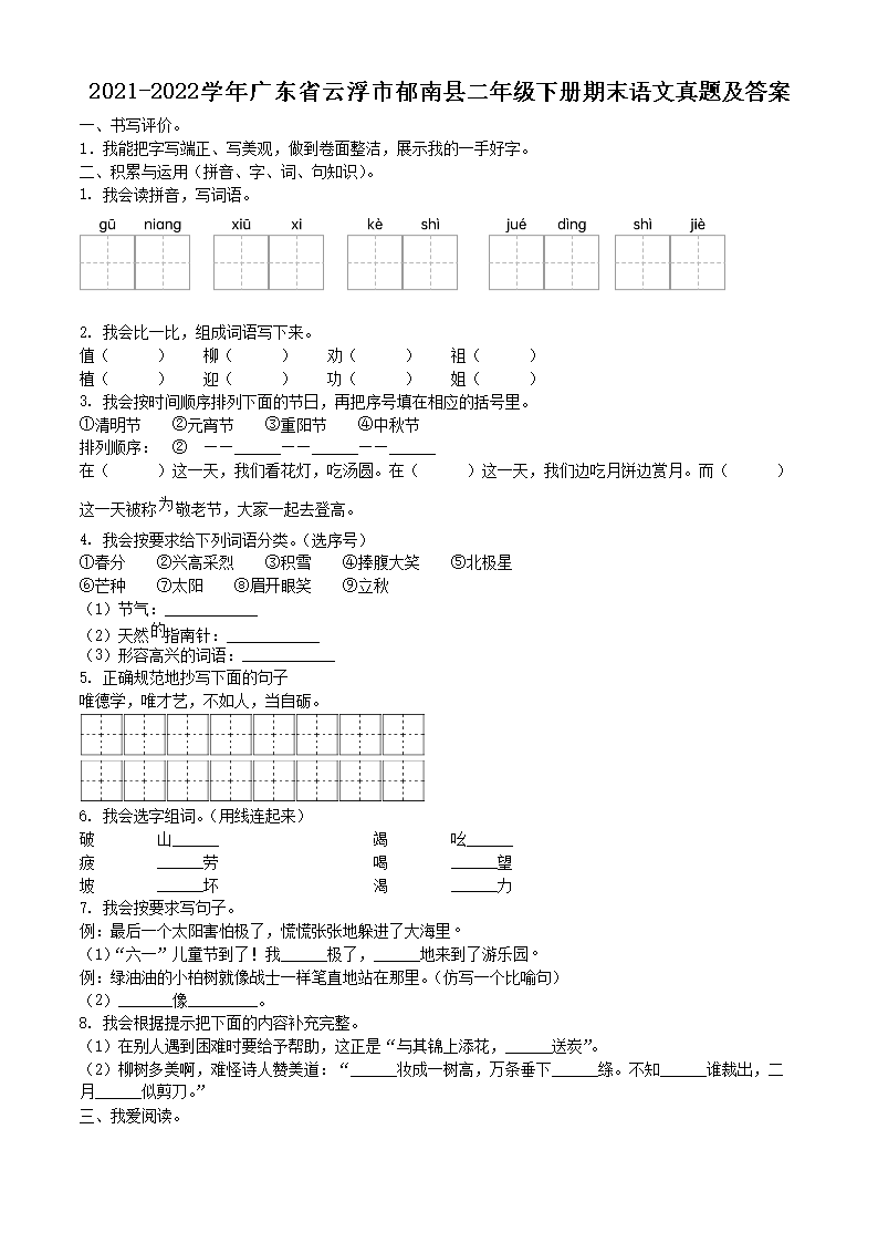 2021-2022学年广东省云浮市郁南县二年级下册期末语文真题及答案(Word版)07-29