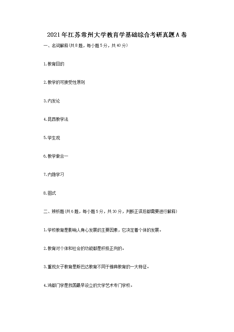 2021年江苏常州大学教育学基础综合考研真题A卷(Word版)08-29