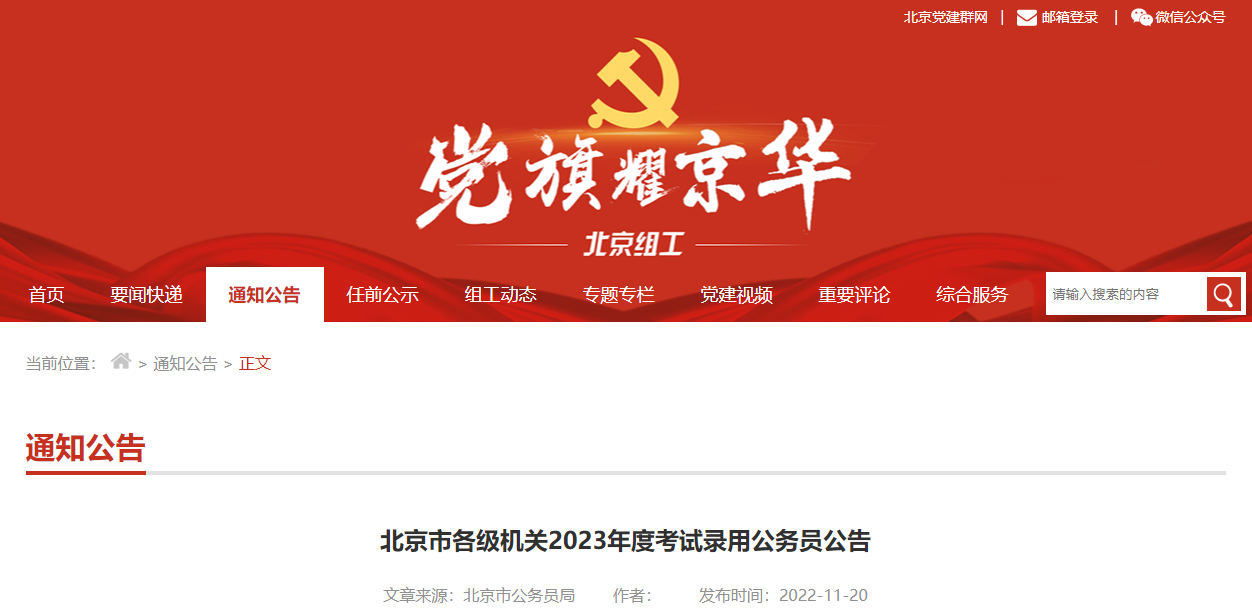 【#公务员考试# 导语】©文档大全网从北京组工网获悉,2023年北京考试录用公务员报考工作现已开始,报名时间:2022年11月21日-25日,考试时间:2022年12月10日-11日,更多事宜请参考阅读《考试公告》,官方公告原文如下: