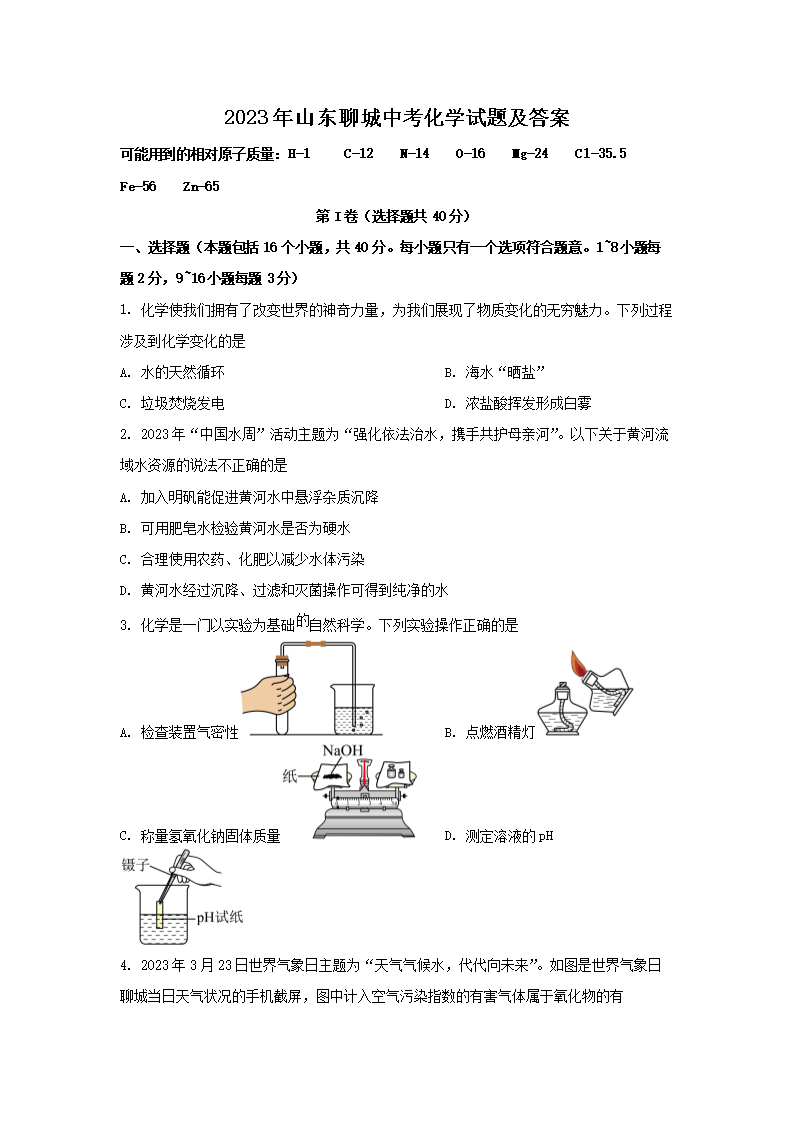 【文档预览】 文档大全网整理发布2023年山东聊城中考化学试题及答案(Word版),前五页预览如下: