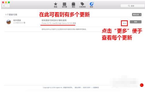 4、这时,如果有新的更新可用,将会在窗口中显示出来。注意,如果提示有多个更新,又想要一一查看,则可以点击后面的“更多”。