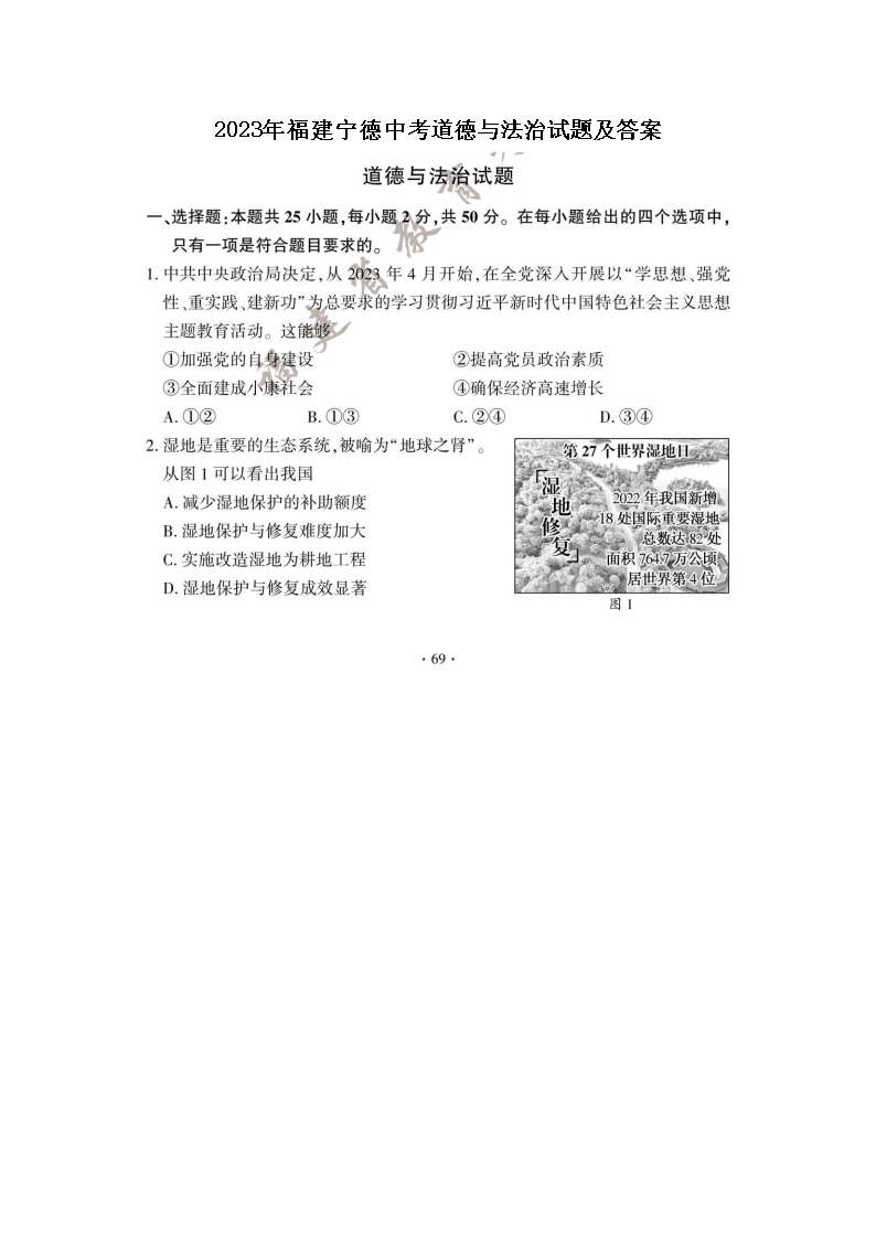 2023年福建宁德中考道德与法治试题及答案(图片版)06-27