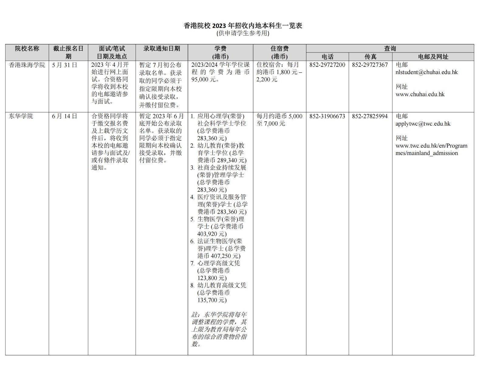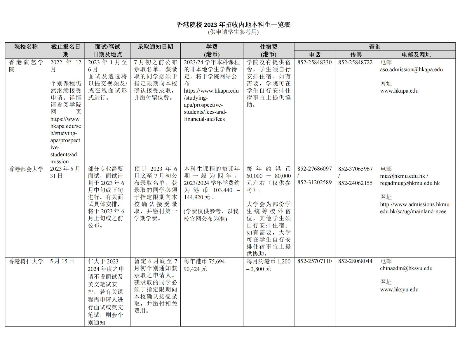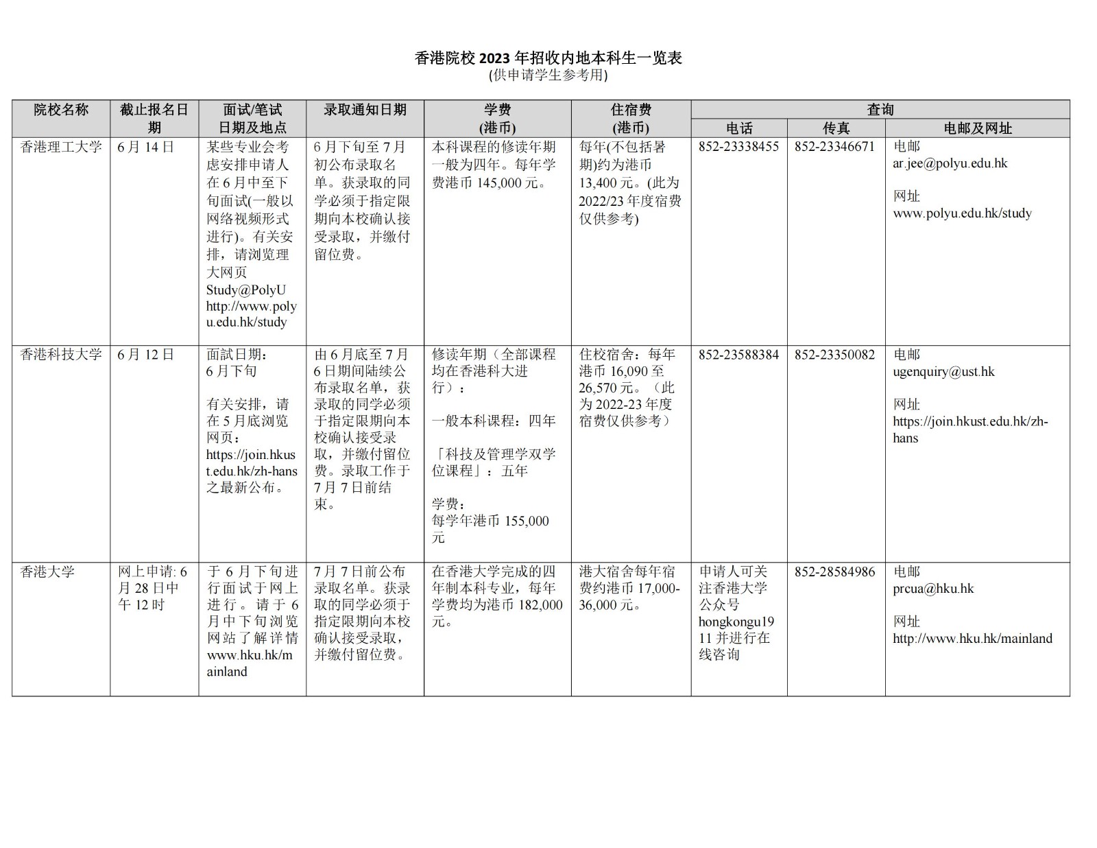 香港院校2023年招收内地本科生一览表04-14