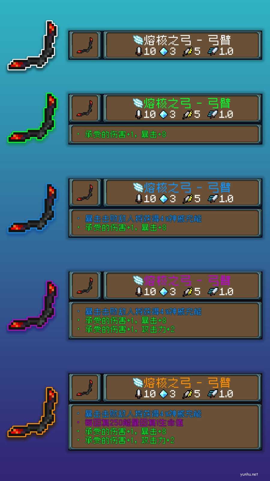 由于长期埋于地下,每个部件受到的侵蚀程度也有所差异!因此,根据神器保存情况,神器部件会分 白绿蓝紫橙红 这6个品质,其中红色品质的武器部件只能从击败boss后掉落的宝箱中获取!