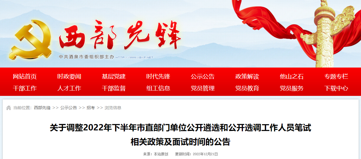 2022下半年甘肃酒泉市直部门单位公开遴选公务员面试时间调整通知(12月31日进行)12-23