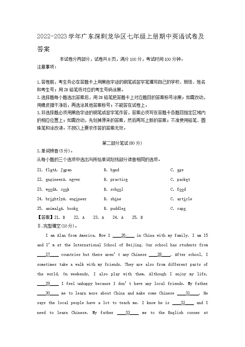 2022-2023学年广东深圳龙华区七年级上册期中英语试卷及答案(Word版)09-26