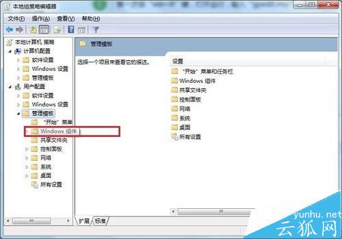 2、进去本地组策略编辑器之后,点击“用户配置----->管理模板------->windows组件”,如下图所示: